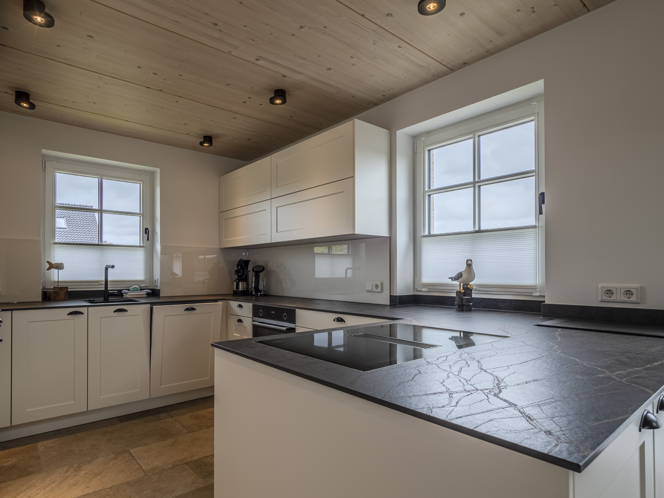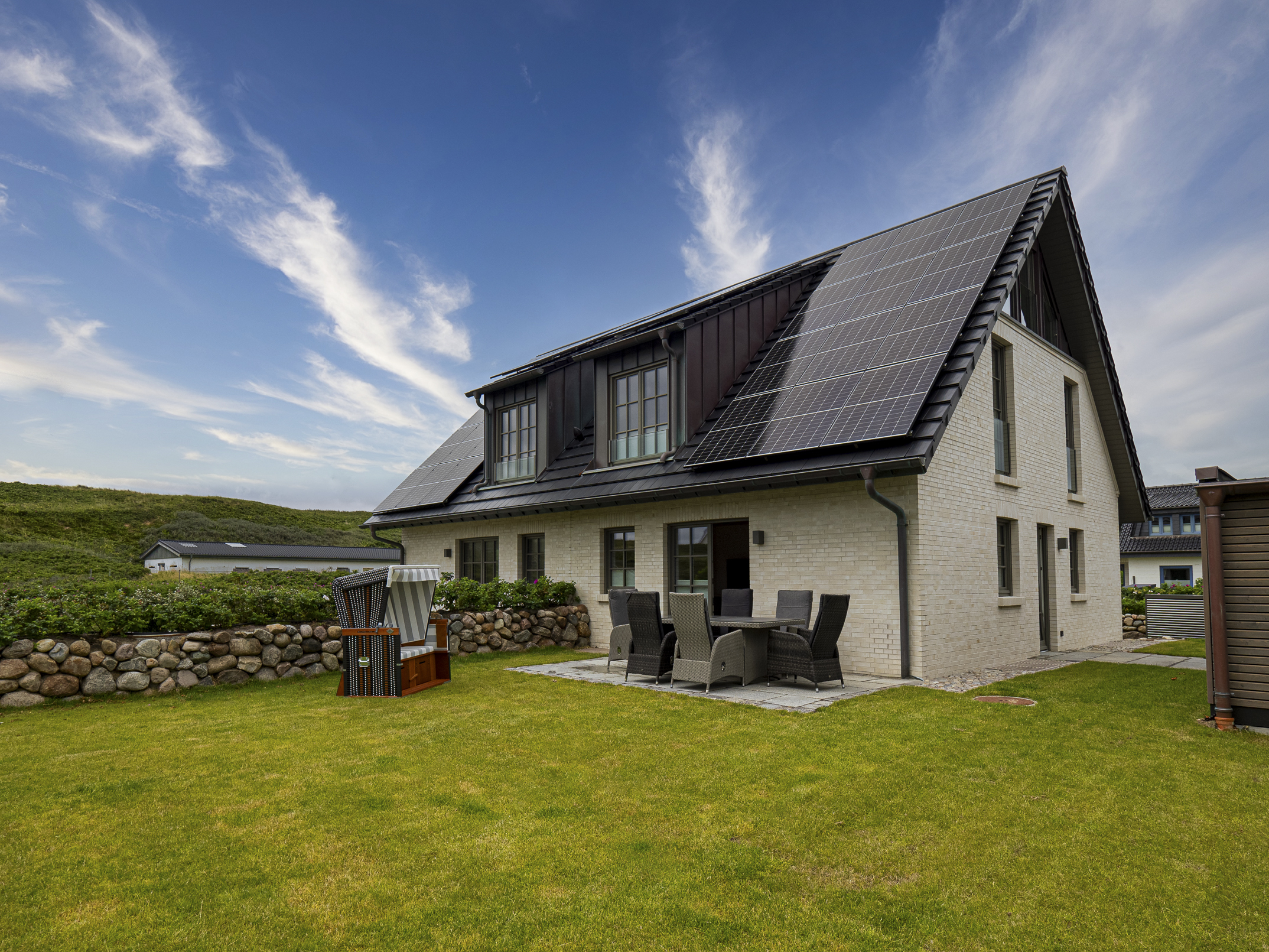 Ein besonderes Highlight sind die Terrasse und die umliegenden Grünflächen. Hier genießen Sie sonnige Stunden im Freien, die frische Nordseeluft und die besondere Atmosphäre der Insel. Stilvolle Kupferelemente an Fenstern und Giebel unterstreichen den hochwertigen Charakter der Immobilie und verleihen ihr eine besondere Optik.